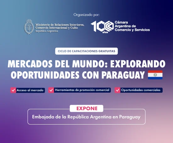 Acceso al mercado | Oportunidades comerciales | Herramientas de promoción comercial ACTIVIDAD SIN COSTO | CUPOS LIMITADOS 24 de junio 10 H Vía Zoom Link: https://eventos.cac.com.ar/event?h=64d7e5682dc04e3ef3f9ccef10f9897ad471f79583a22acb3252c4ea468e2d53 Fuente: https://cac.com.ar/eventos/mercados-del-mundo-explorando-oportunidades-en-paraguay?utm_campaign=60258510-Ciclo%20de%20capacitaciones%20%7C%20PyMEs%20al%20Mundo&utm_medium=email&_hsenc=p2ANqtz--ug-py2gJHb3Z6Q9pMHQL6jcnZMBi9NkiIguHHs0Ewq_3wk5yzEOFrJbe6_BsA9gHJ7EN-hsZIGBsB3FKy9-OgCUahhA&_hsmi=111214809&utm_content=111214809&utm_source=hs_email